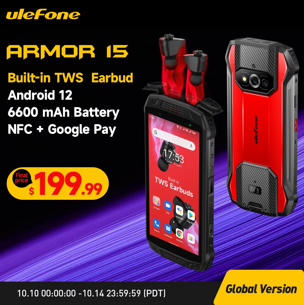 Ulefone Armor 15 Rugged Phone Android 12 Built-in TWS Earbuds Smartphone 6600mAh 128GB NFC 2.4G/5G WLAN Waterproof Mobile Phones