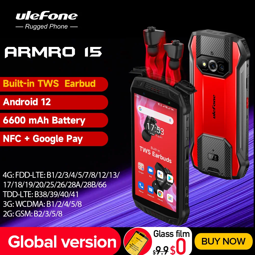 Ulefone Armor 15 Smartphone Android 12 6600mAh Rugged Phone Built-in TWS Earbuds 6GB +128GB Waterproof Mobile Phones NFC